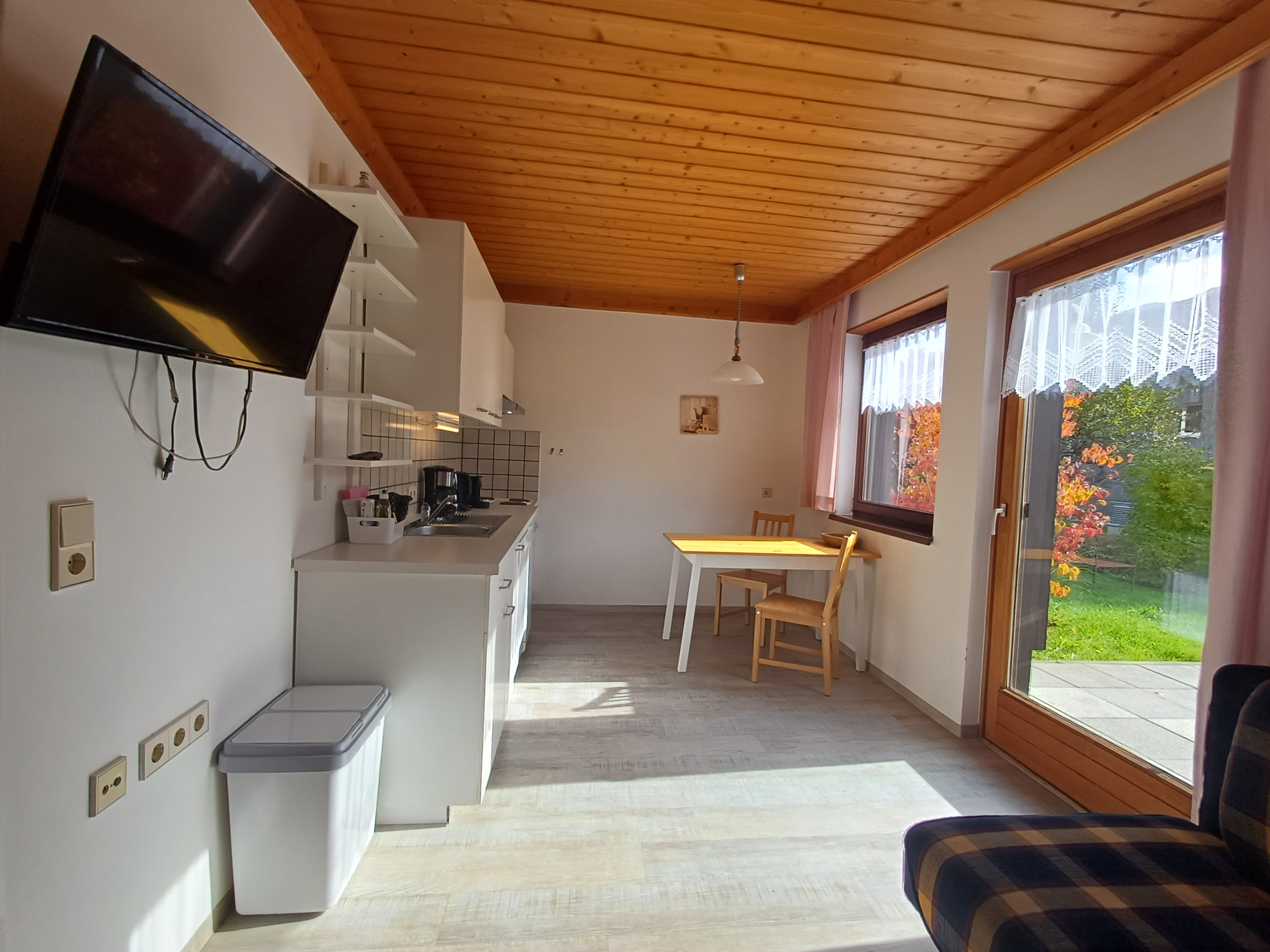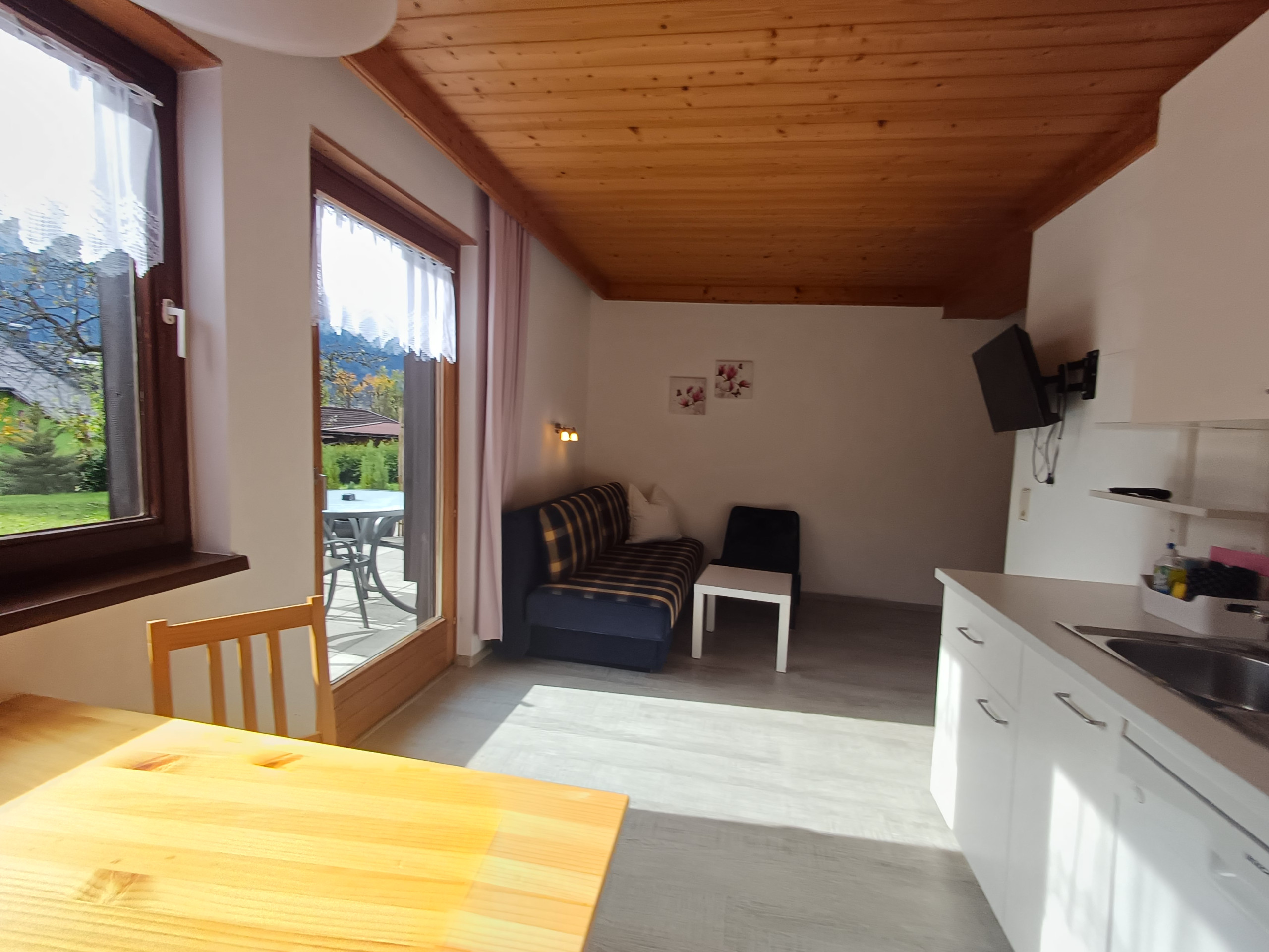 Apartment C is located on the ground floor and sleeps 2 persons in total comfortably in a double bed. When you enter the apartment there is a hugh hall offering a lot of space for your ski clothes. The hall leads into the bedroom to the very left side with a double bed. Then you have a bathroom with shower, sink and a toilet. To the right side you enter the living room with a good equipped kitchen with kettle, coffee machine, dish washer, hob and oven. You will have a nice dining area for 4 and sofa with a good sized tv. From here you can access the south facing terrace and the garden overlooking the surrounding mountains and into the Stubach valley.