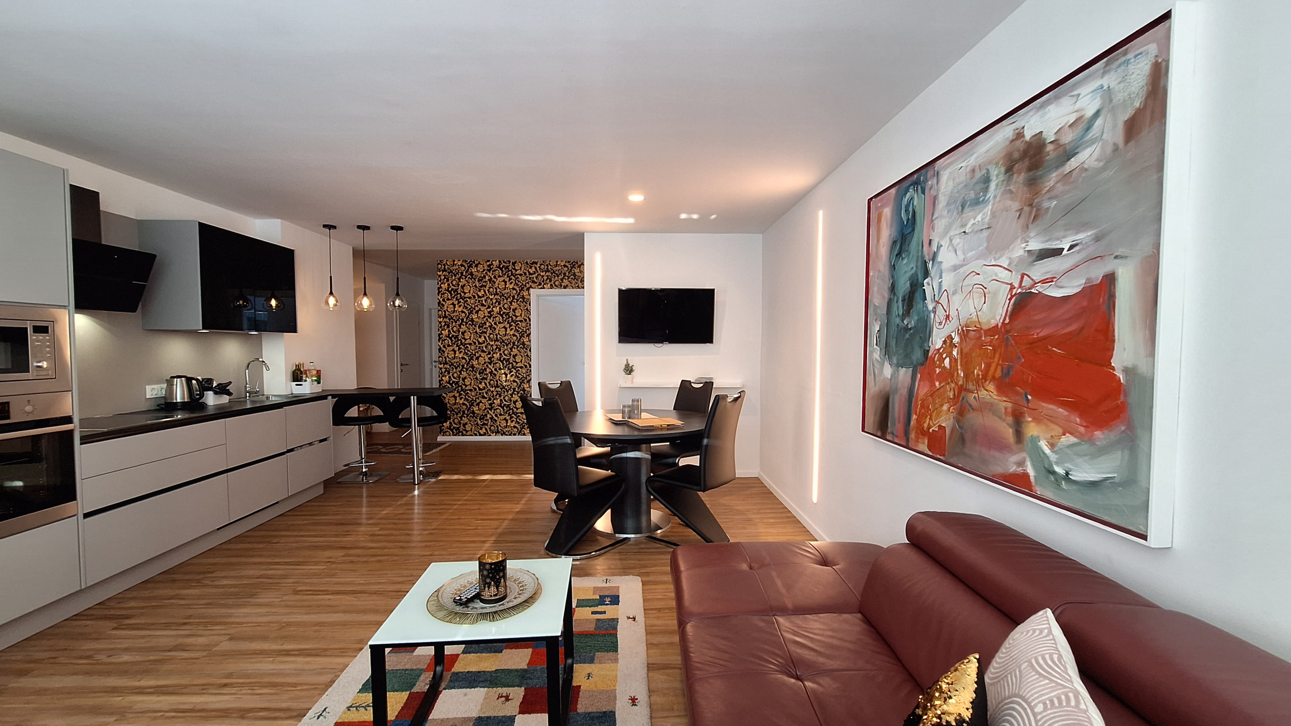 The open and spacious living area invites you to relax after an eventful day. Make yourself comfortable on the comfortable sofa and enjoy a film on one of the two televisions with German and English channels. Thanks to high-speed WiFi and a dedicated workspace, you can also stay connected and work without any problems if needed.