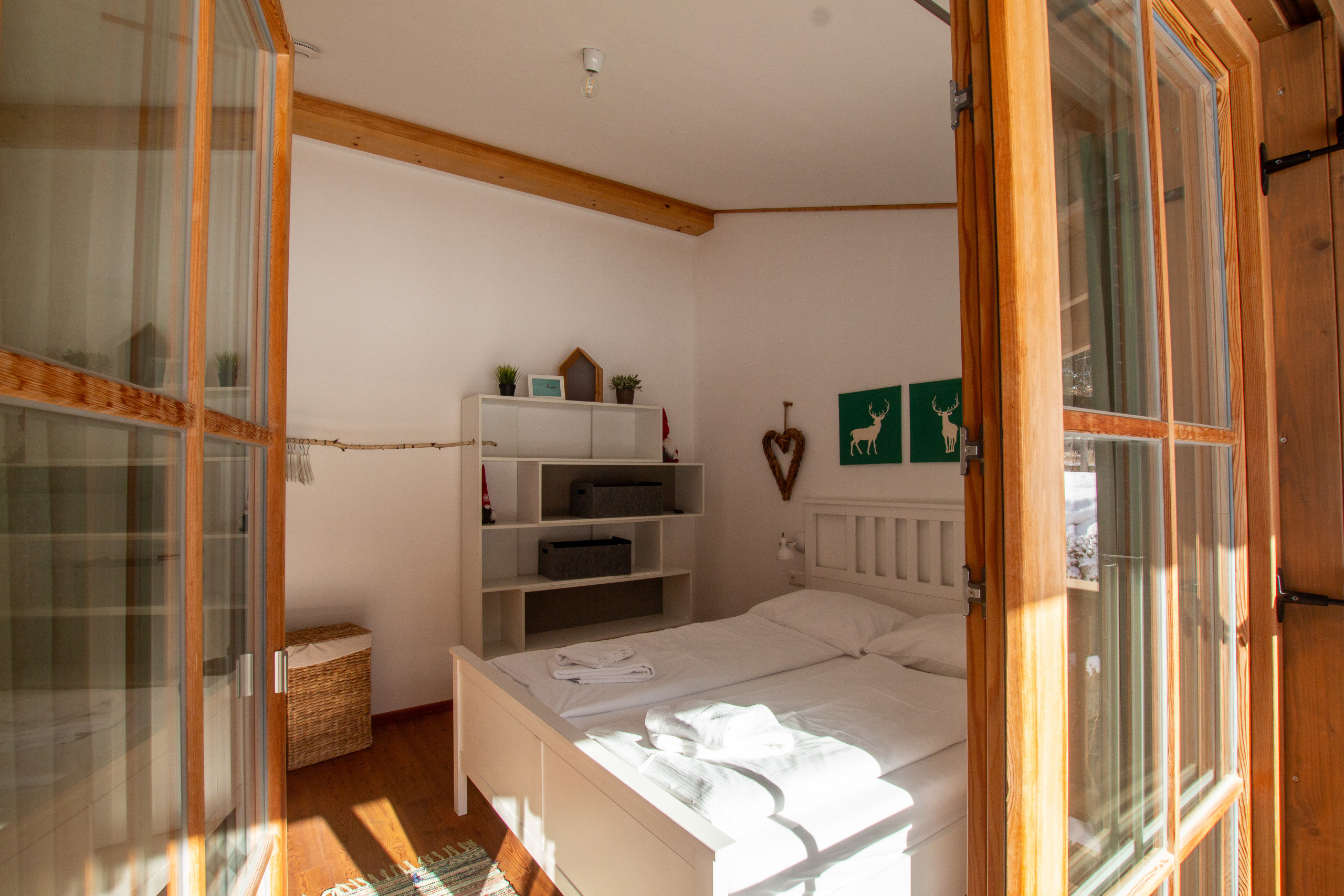 Lodge Eagle`s nest is a comfortable chalet (terraced house) with private garden, 2 double bedrooms, 2 shower rooms, open plan living room with kitchen and dining area, wood pellet burner. The bedrooms have good sized double beds, the master bedroom comes with an en suite bath with tub and toilet. The second bathroom come with a walk-in shower.