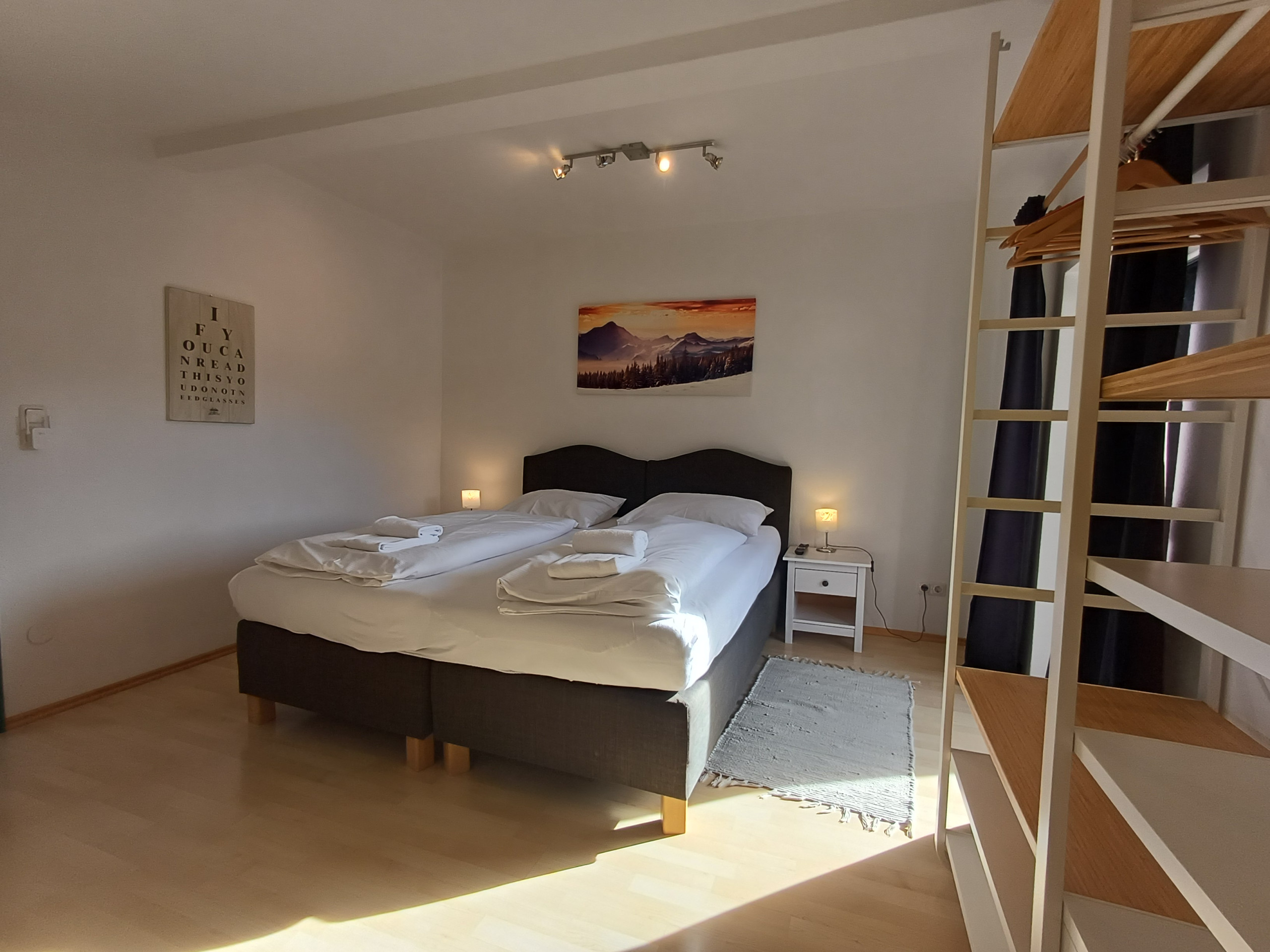 Second floor: two more spacious bedrooms with box spring double beds and storage space await you. In addition, one bedroom is connected to the panoramic balcony and also has a TV.