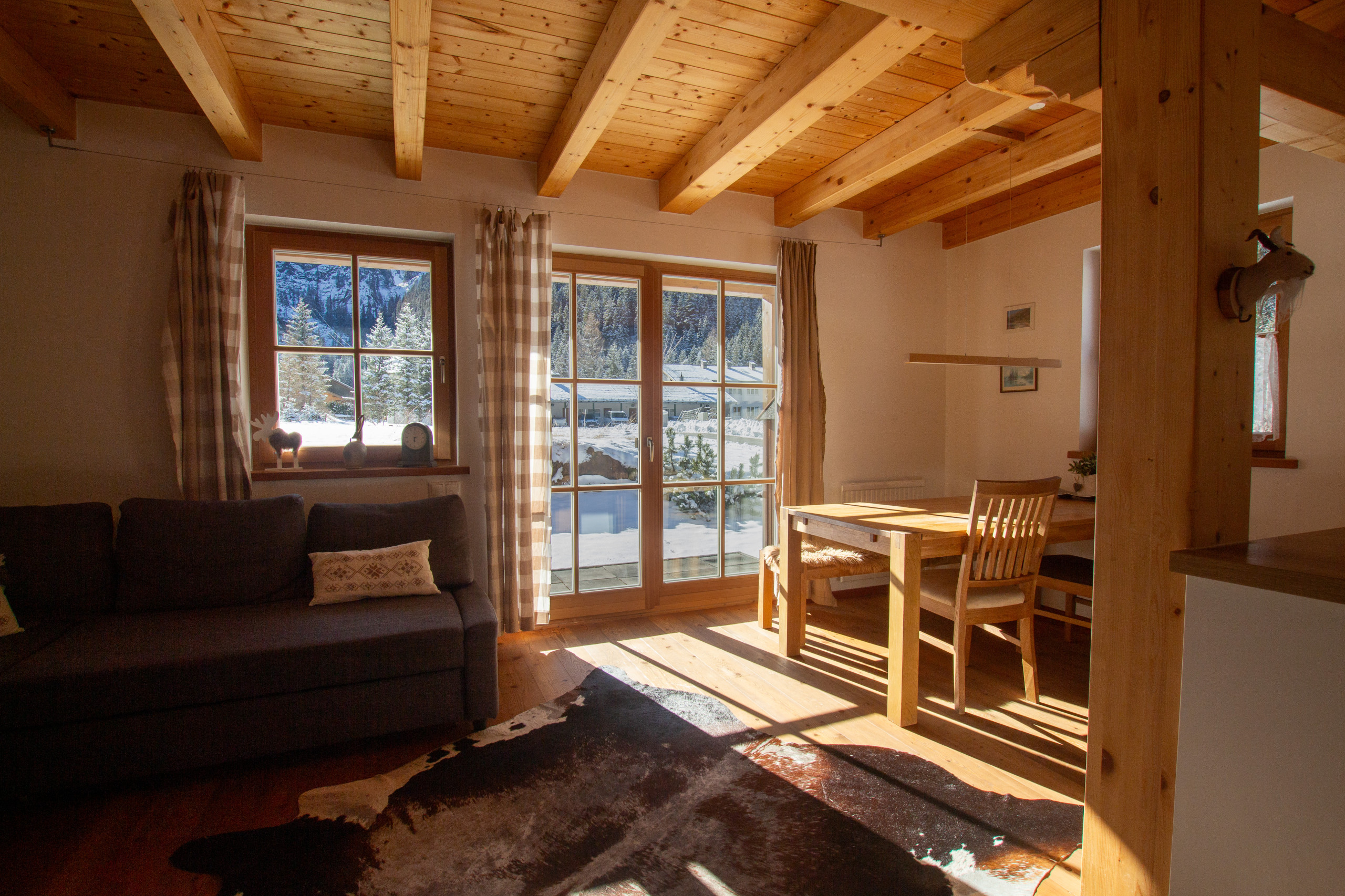 Der offene Wohnbereich mit hellen Holzoberflächen und gemütlicher Sofaecke ist der ideale Ort, um nach einem Tag in den Bergen zusammenzukommen. Genießen Sie von der herrlichen Terrasse einen atemberaubenden Blick auf die umliegende Bergwelt.