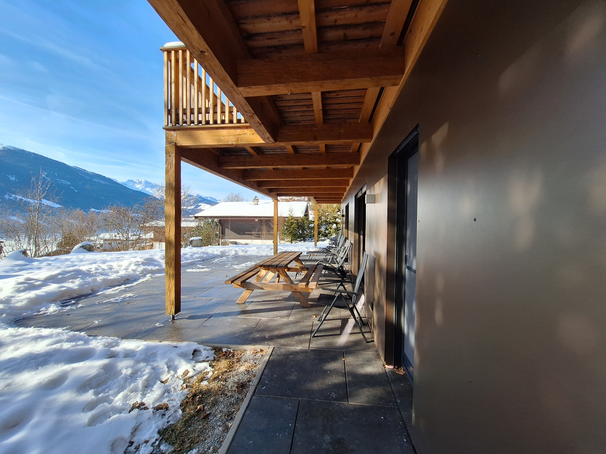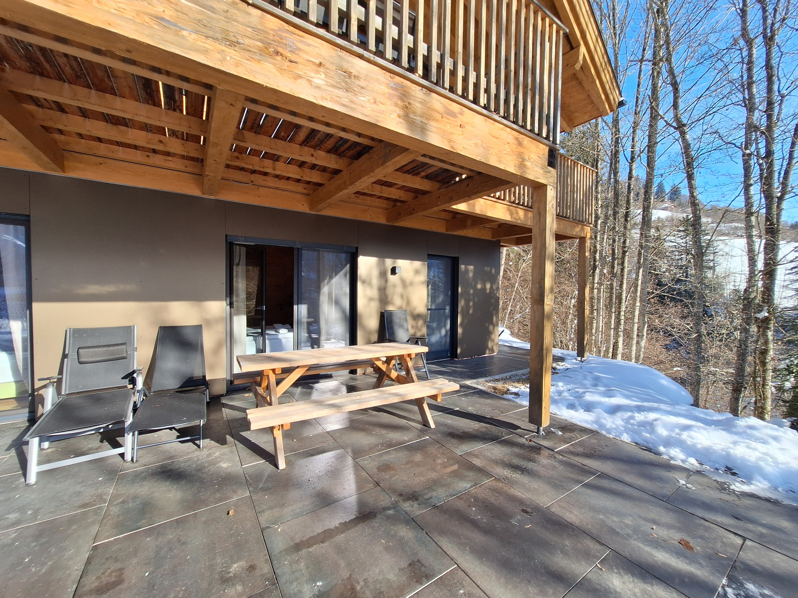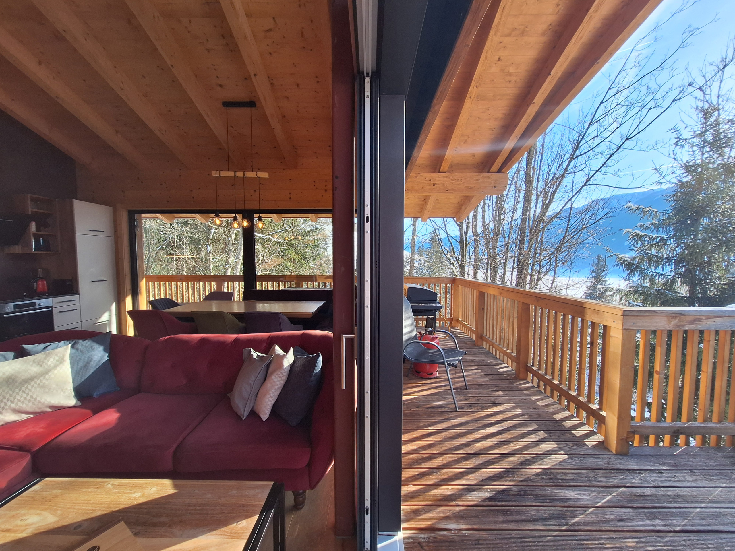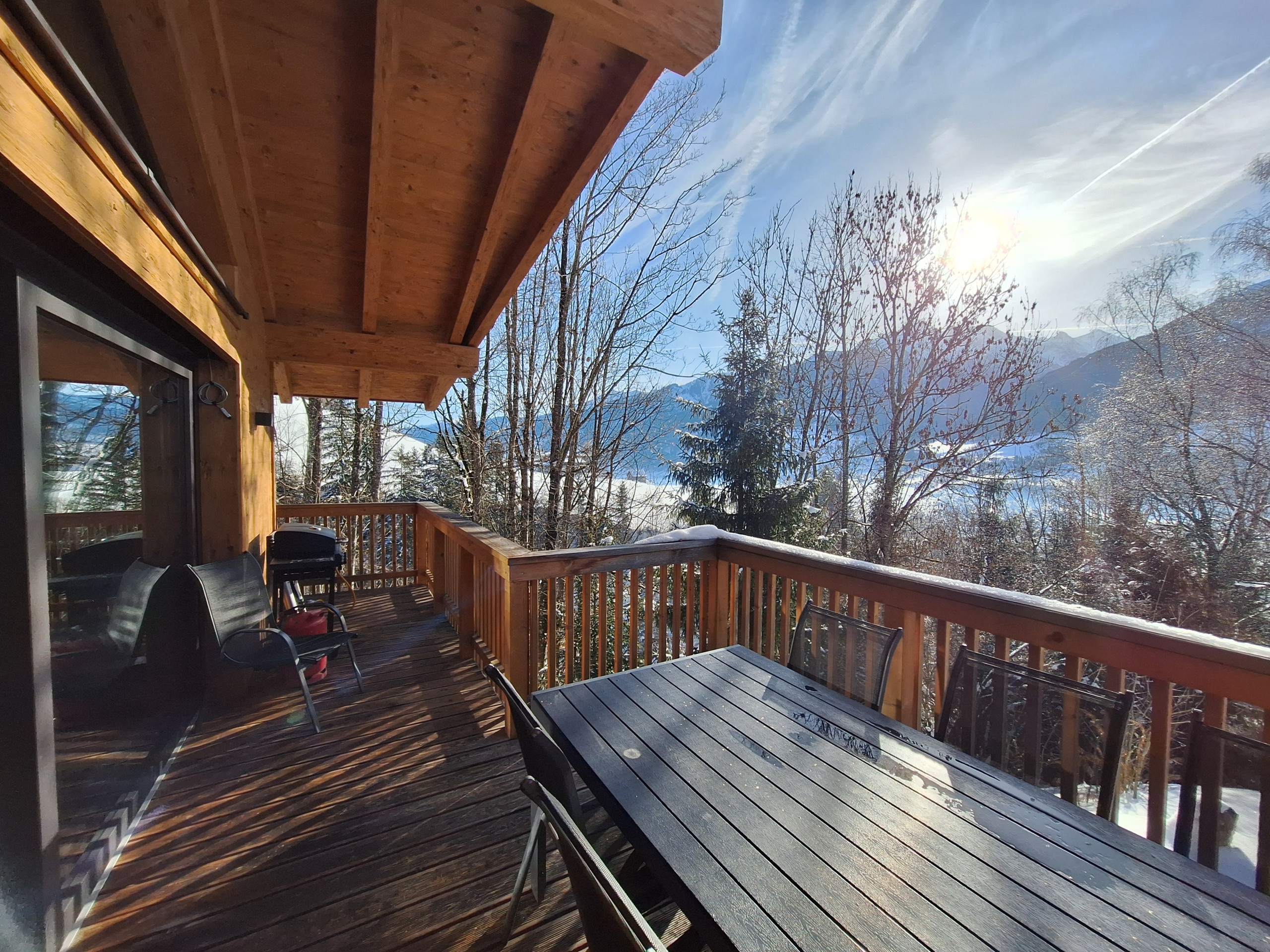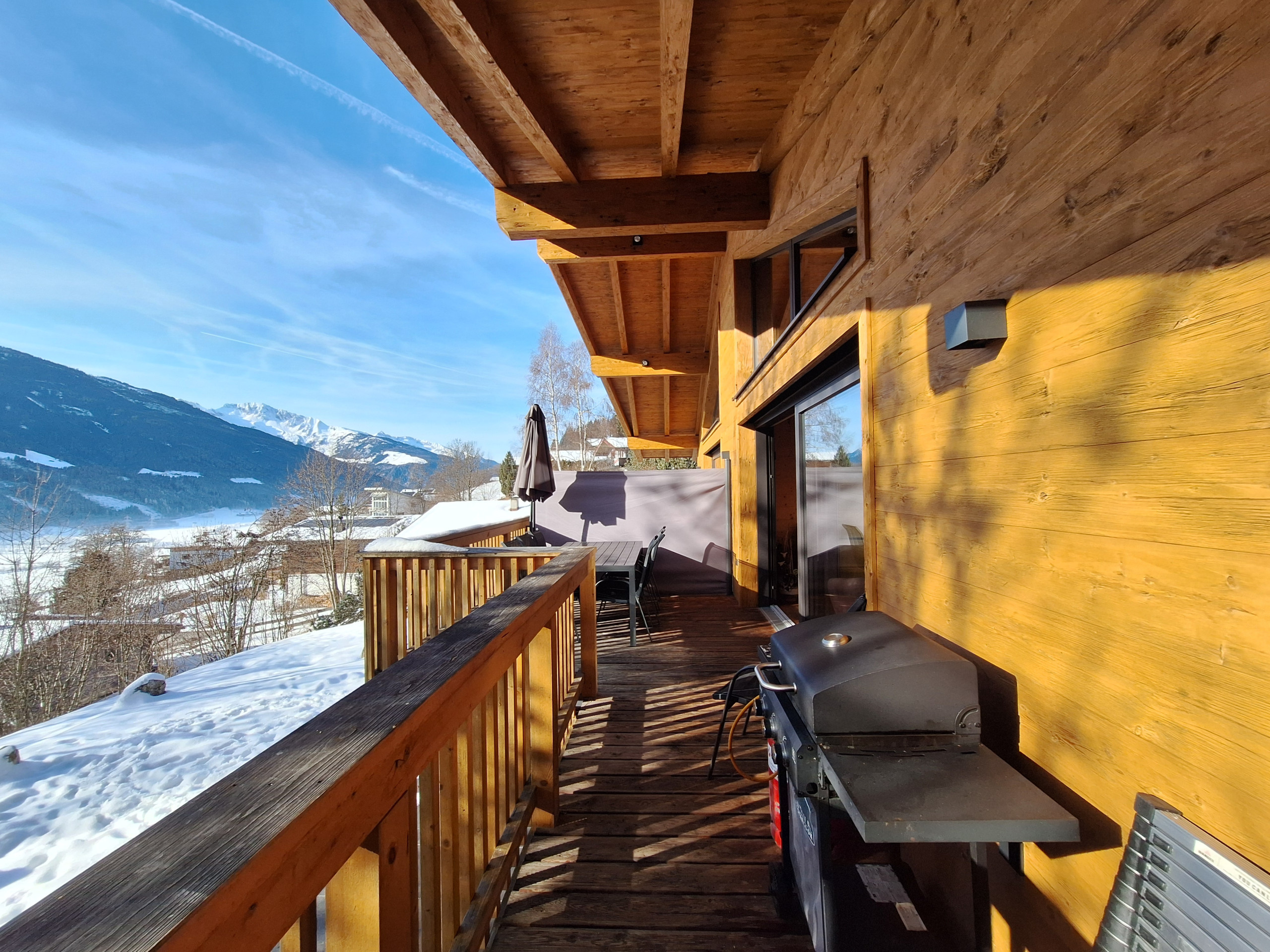 Der Clou des Chalets ist die großzügige Terrasse von 30 m² mit Gartenmöbeln und Grillmöglichkeit. Von hier aus genießen Sie atemberaubende Ausblicke auf die umliegenden Berge und den Garten. Ein zusätzlicher Balkon erweitert den Wohnbereich nach draußen.