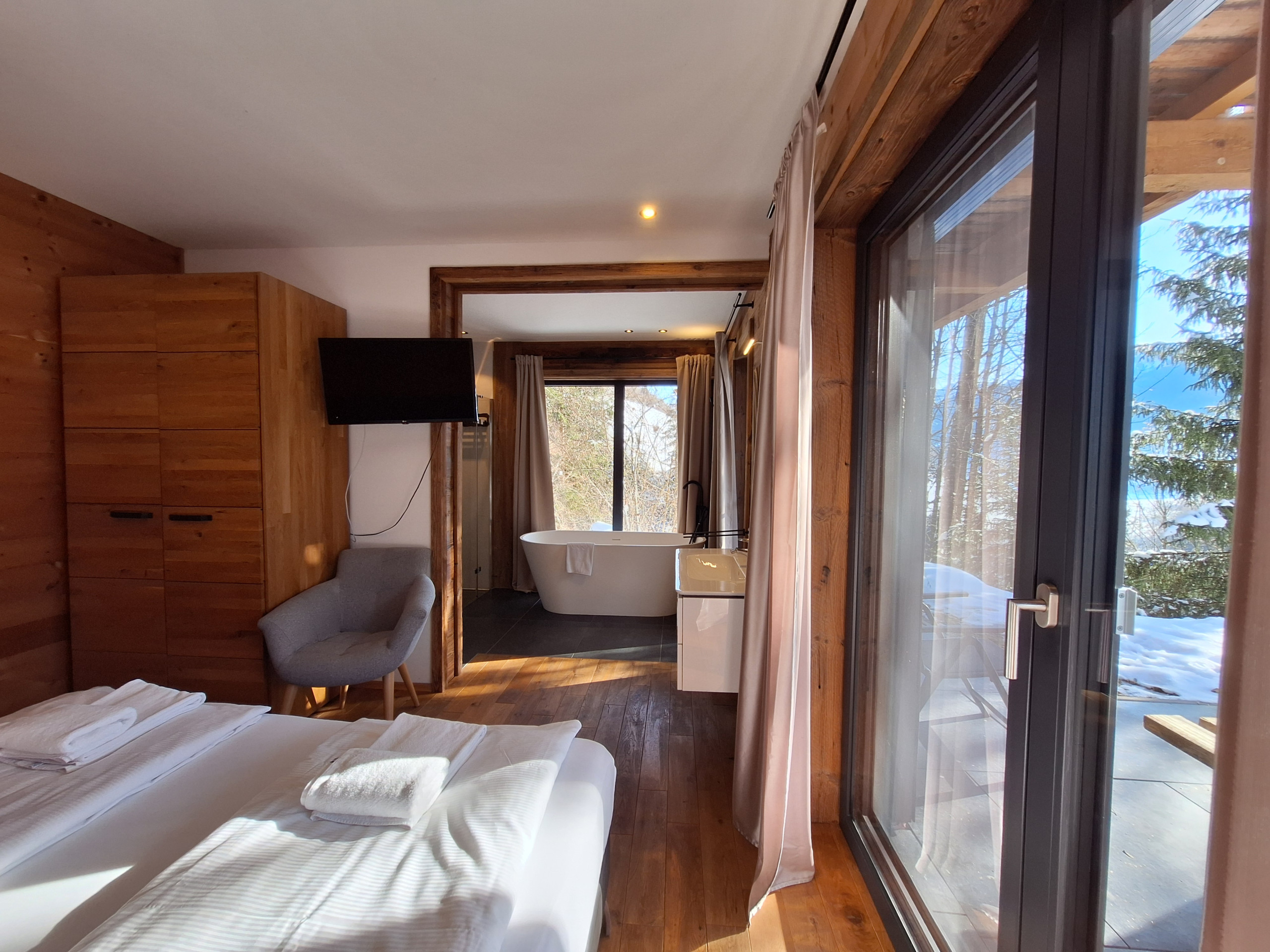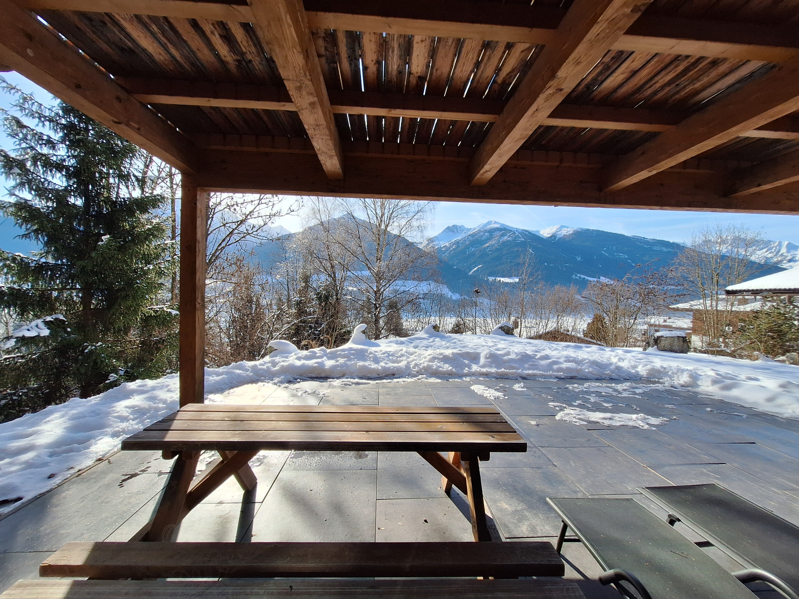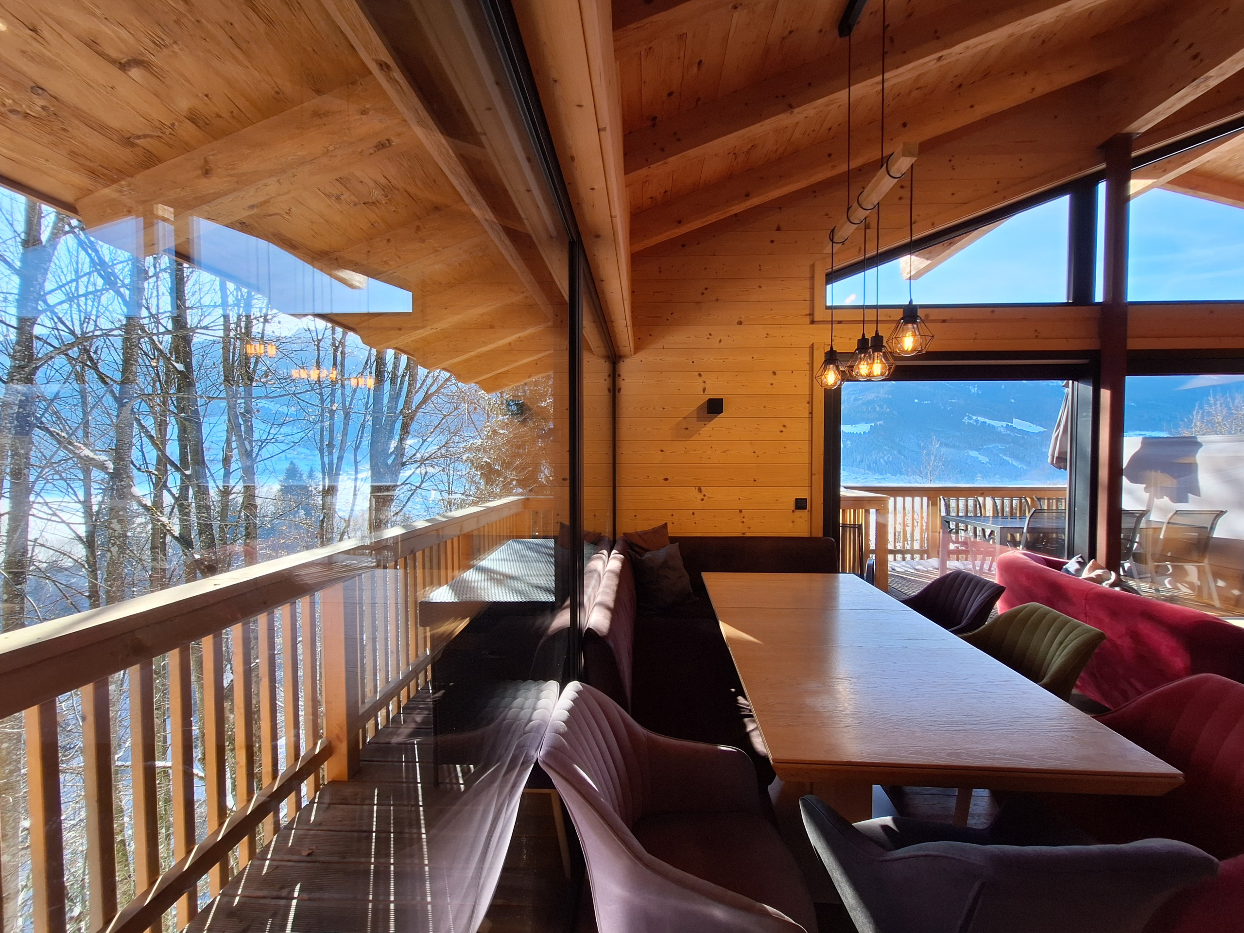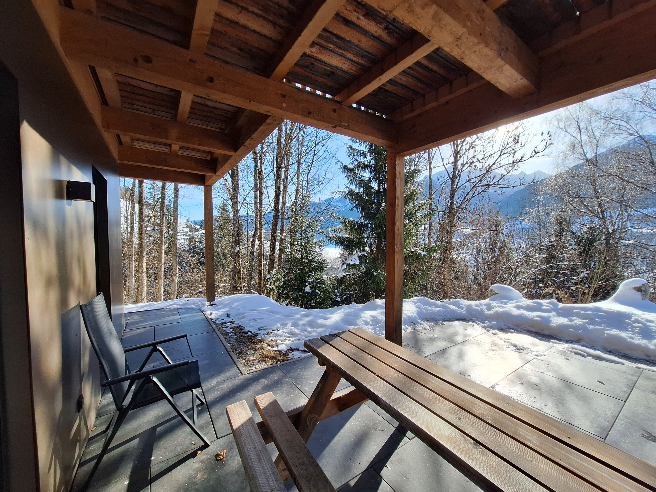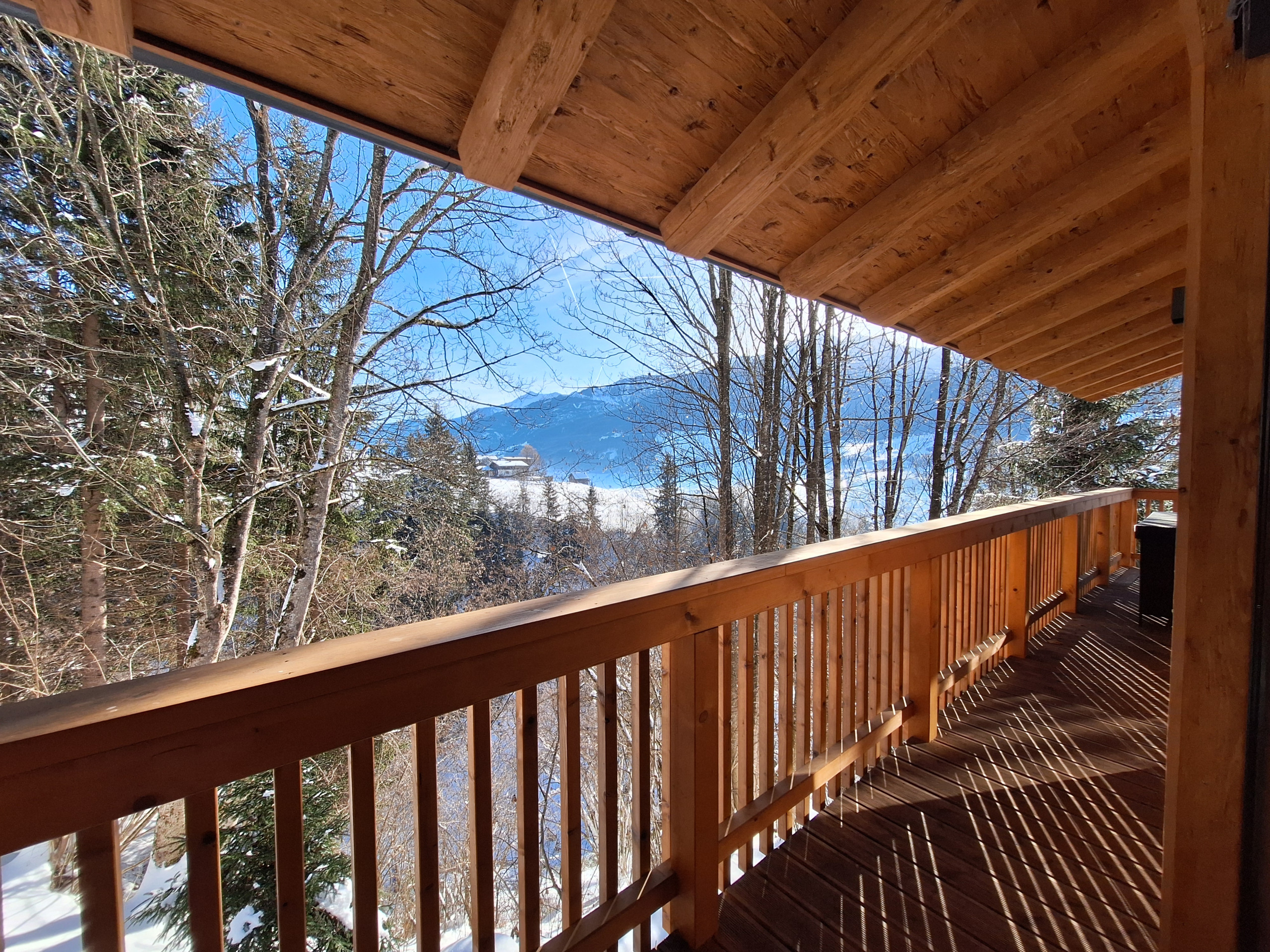 Der Clou des Chalets ist die großzügige Terrasse von 30 m² mit Gartenmöbeln und Grillmöglichkeit. Von hier aus genießen Sie atemberaubende Ausblicke auf die umliegenden Berge und den Garten. Ein zusätzlicher Balkon erweitert den Wohnbereich nach draußen.