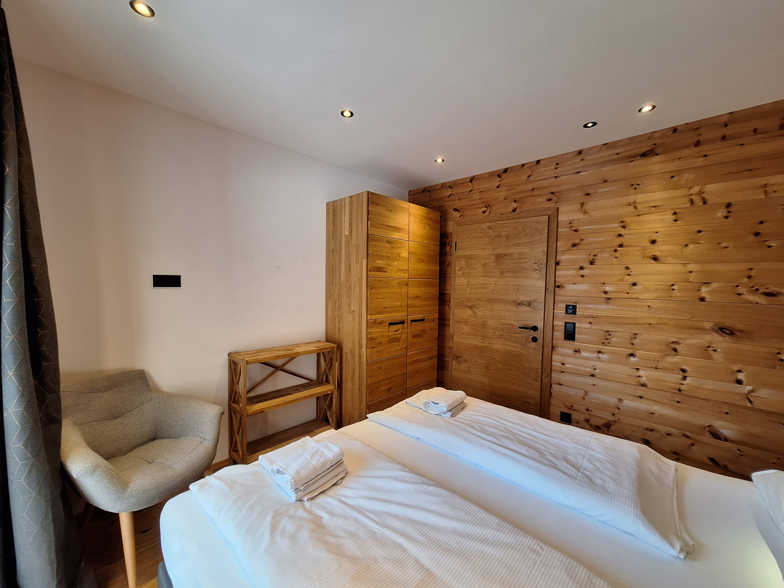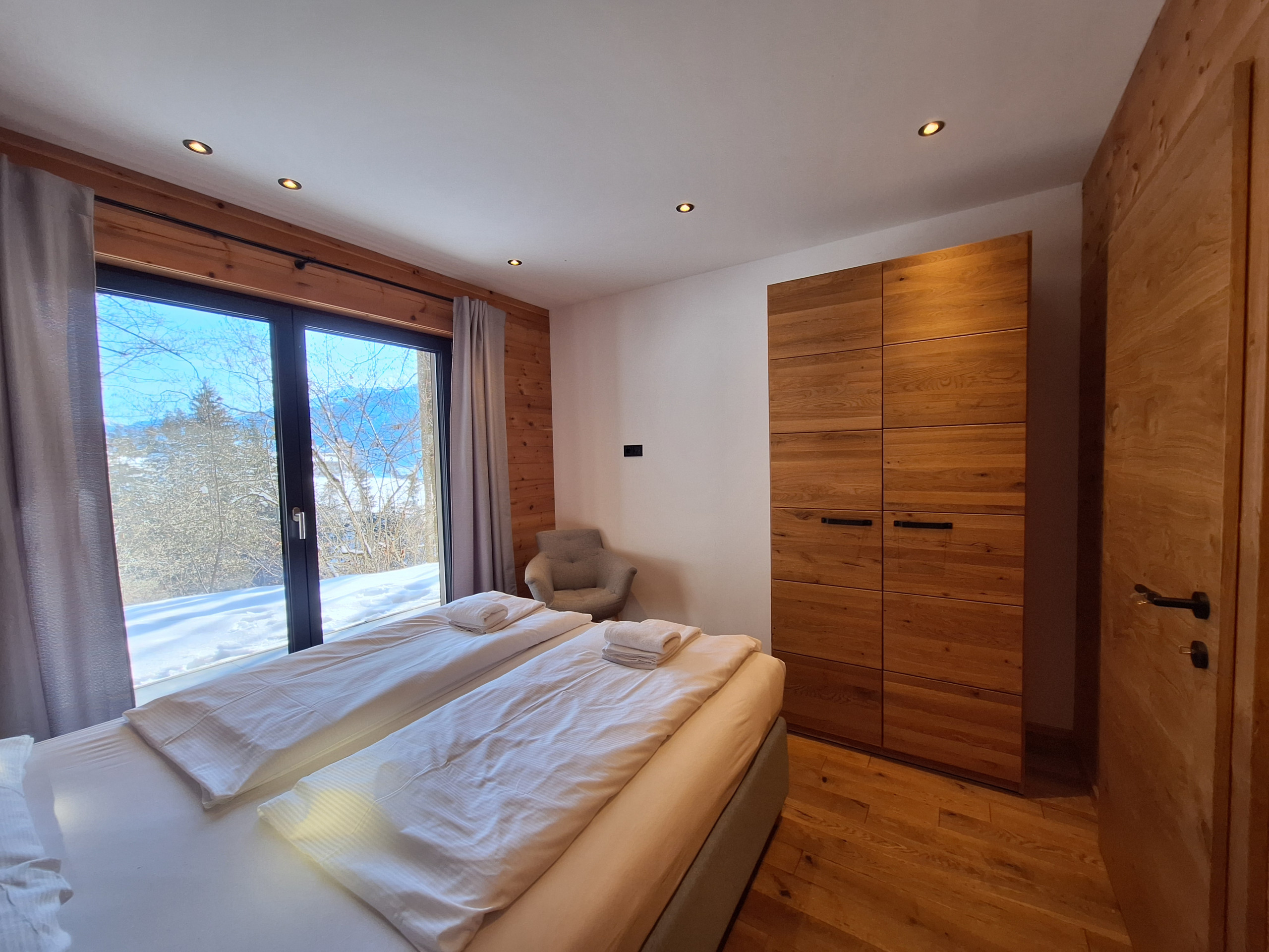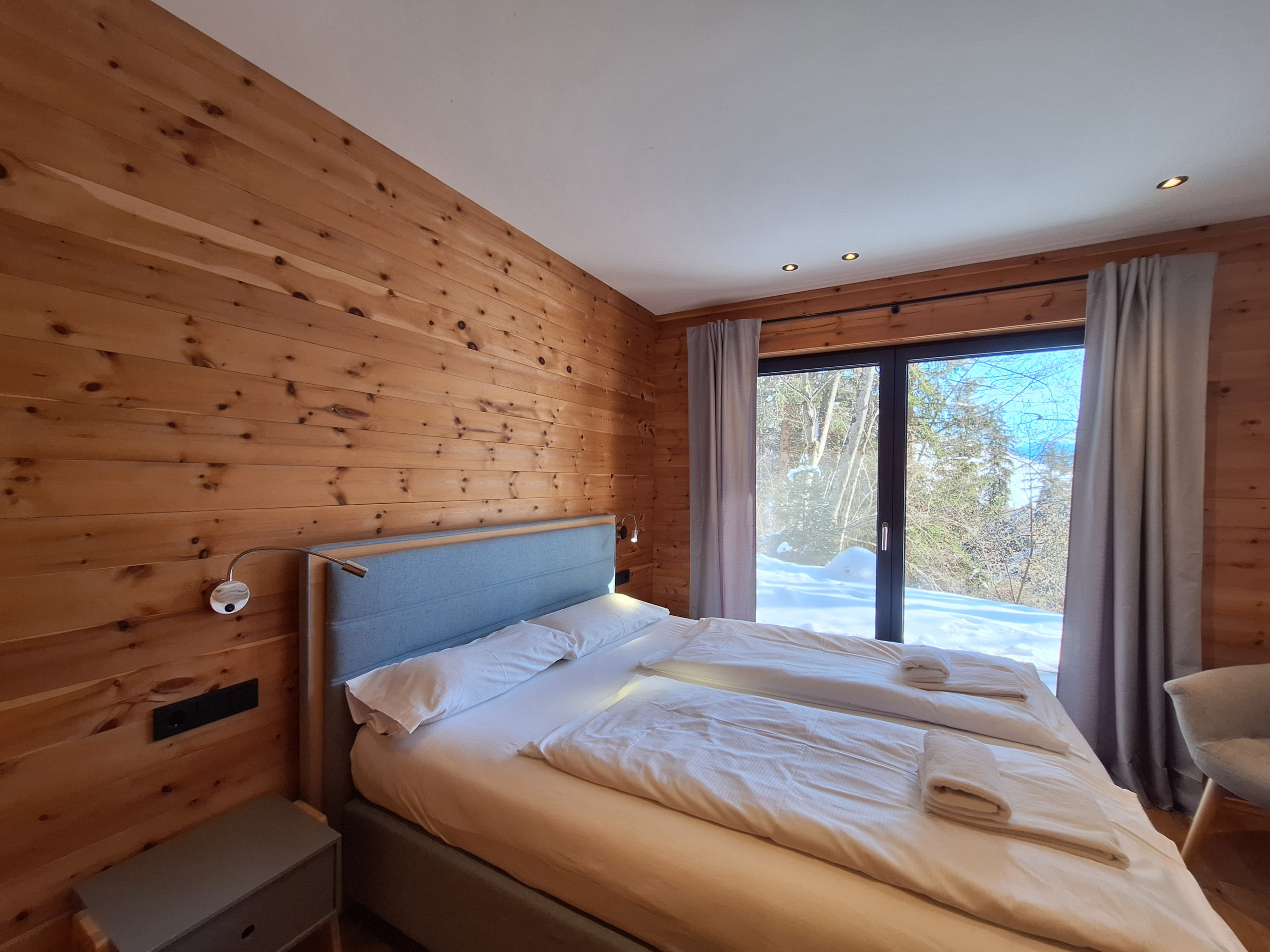Das Chalet (Haushälfte) verfügt über vier gemütliche Schlafzimmer mit jeweils einem Doppelbett, perfekt für erholsame Nächte nach spannenden Tagen in der Natur. Drei moderne Badezimmer - darunter zwei mit Dusche, eines mit Badewanne und Dusche sorgen für maximalen Komfort und Privatsphäre aller Gäste.