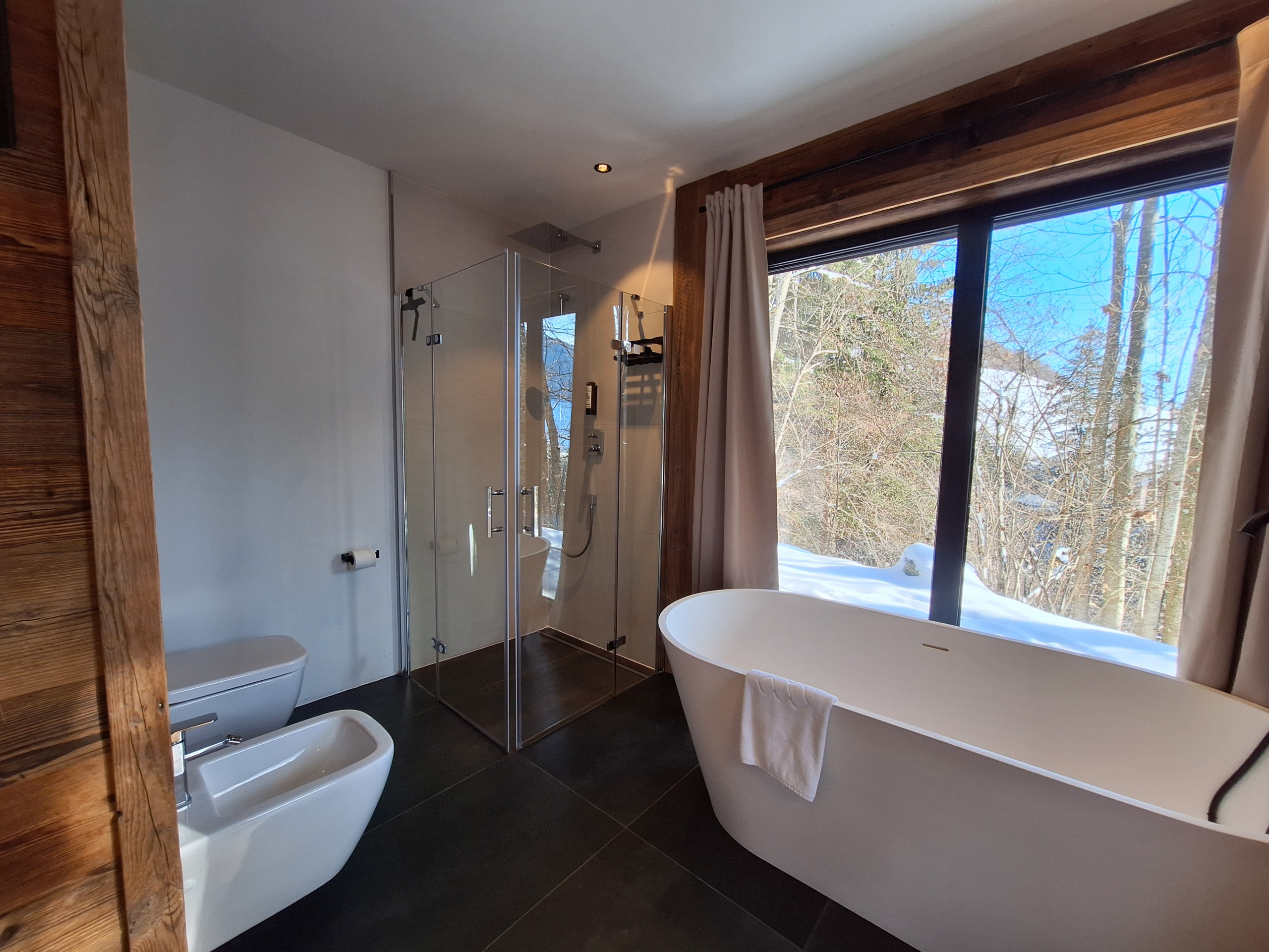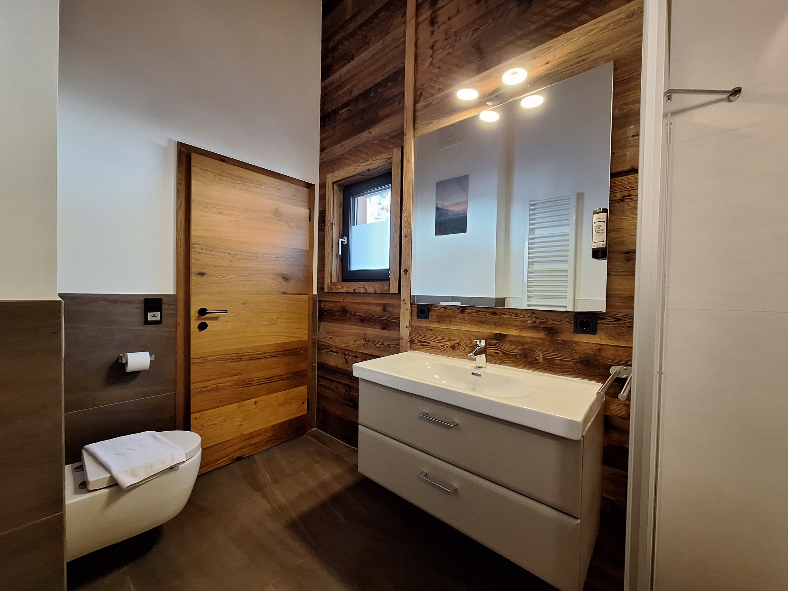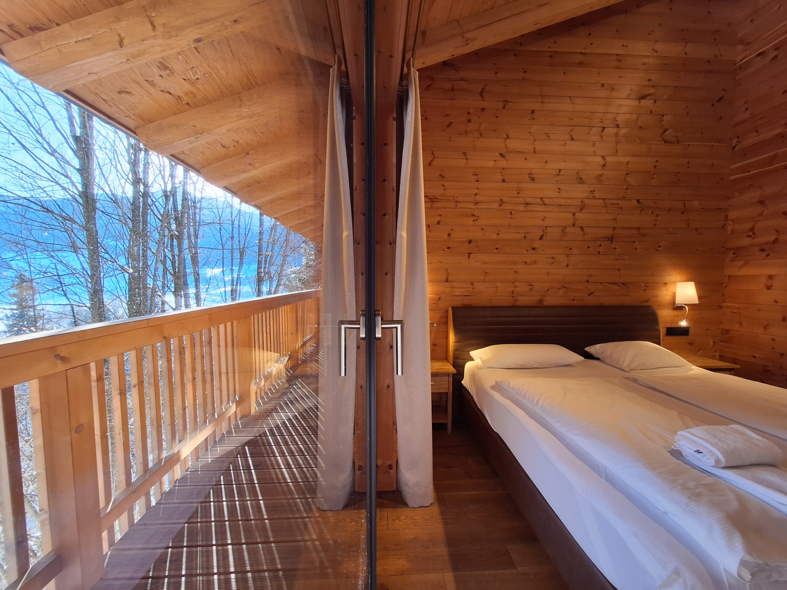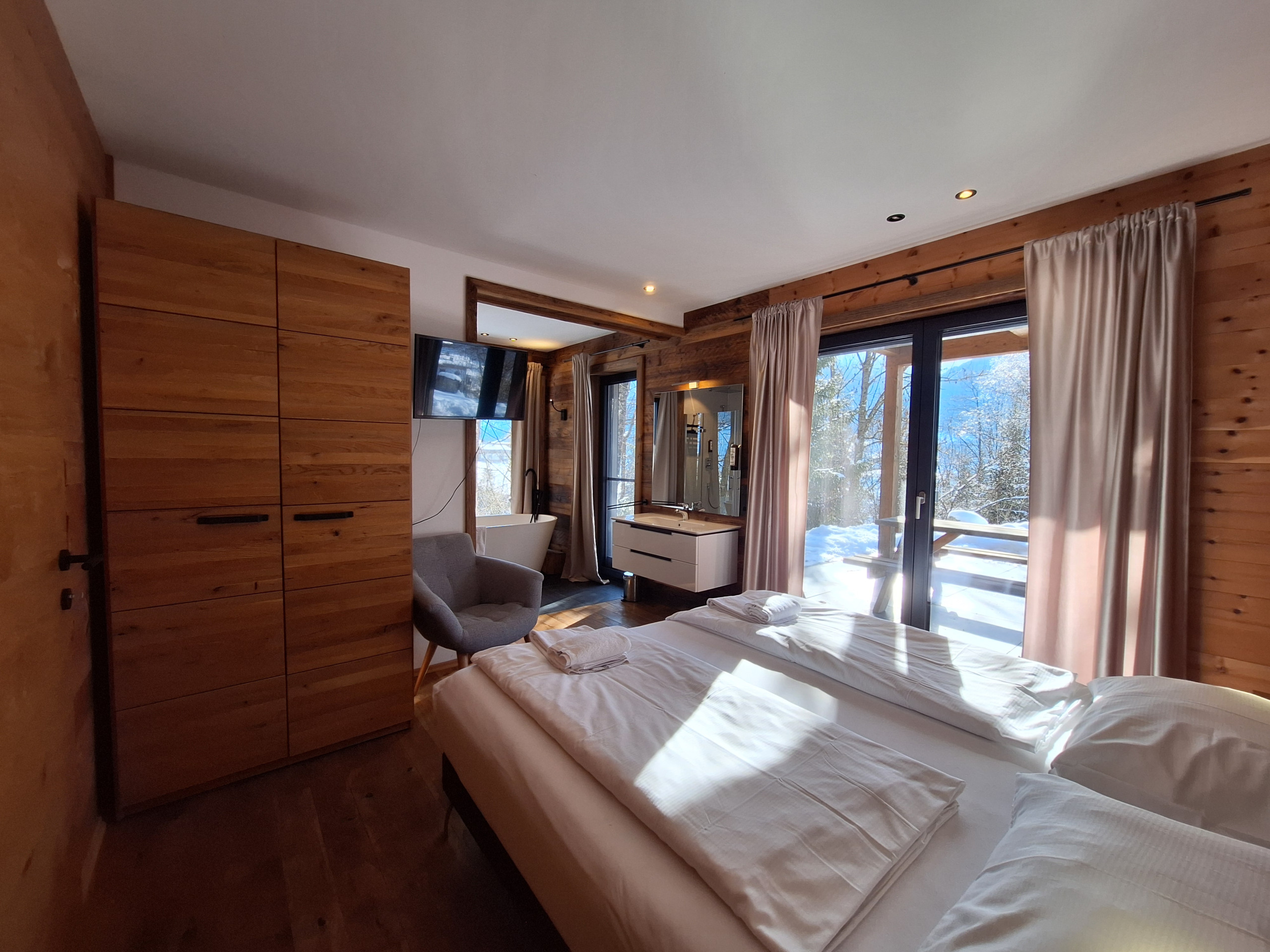 Das Chalet (Haushälfte) verfügt über vier gemütliche Schlafzimmer mit jeweils einem Doppelbett, perfekt für erholsame Nächte nach spannenden Tagen in der Natur. Drei moderne Badezimmer - darunter zwei mit Dusche, eines mit Badewanne und Dusche sorgen für maximalen Komfort und Privatsphäre aller Gäste.