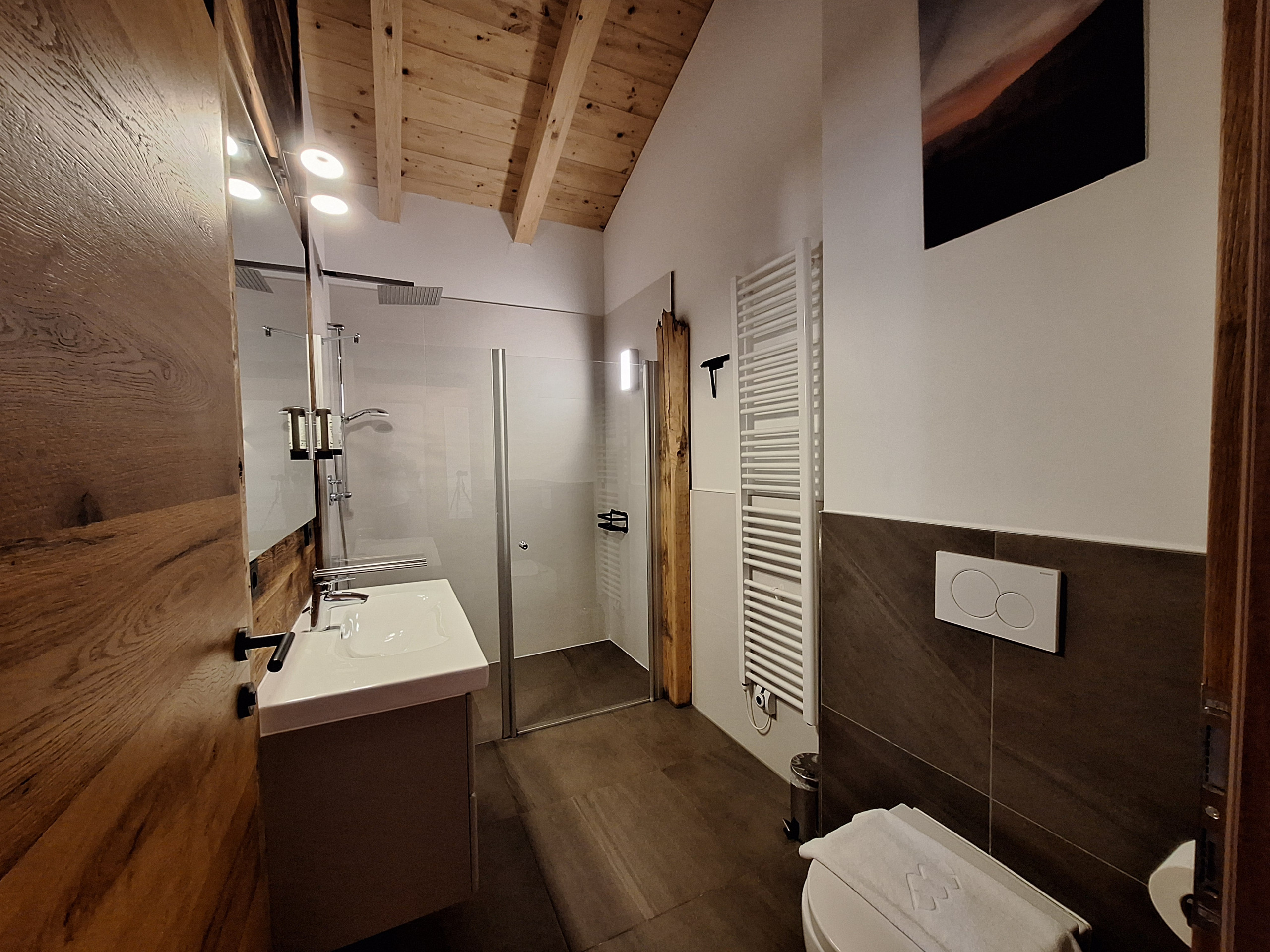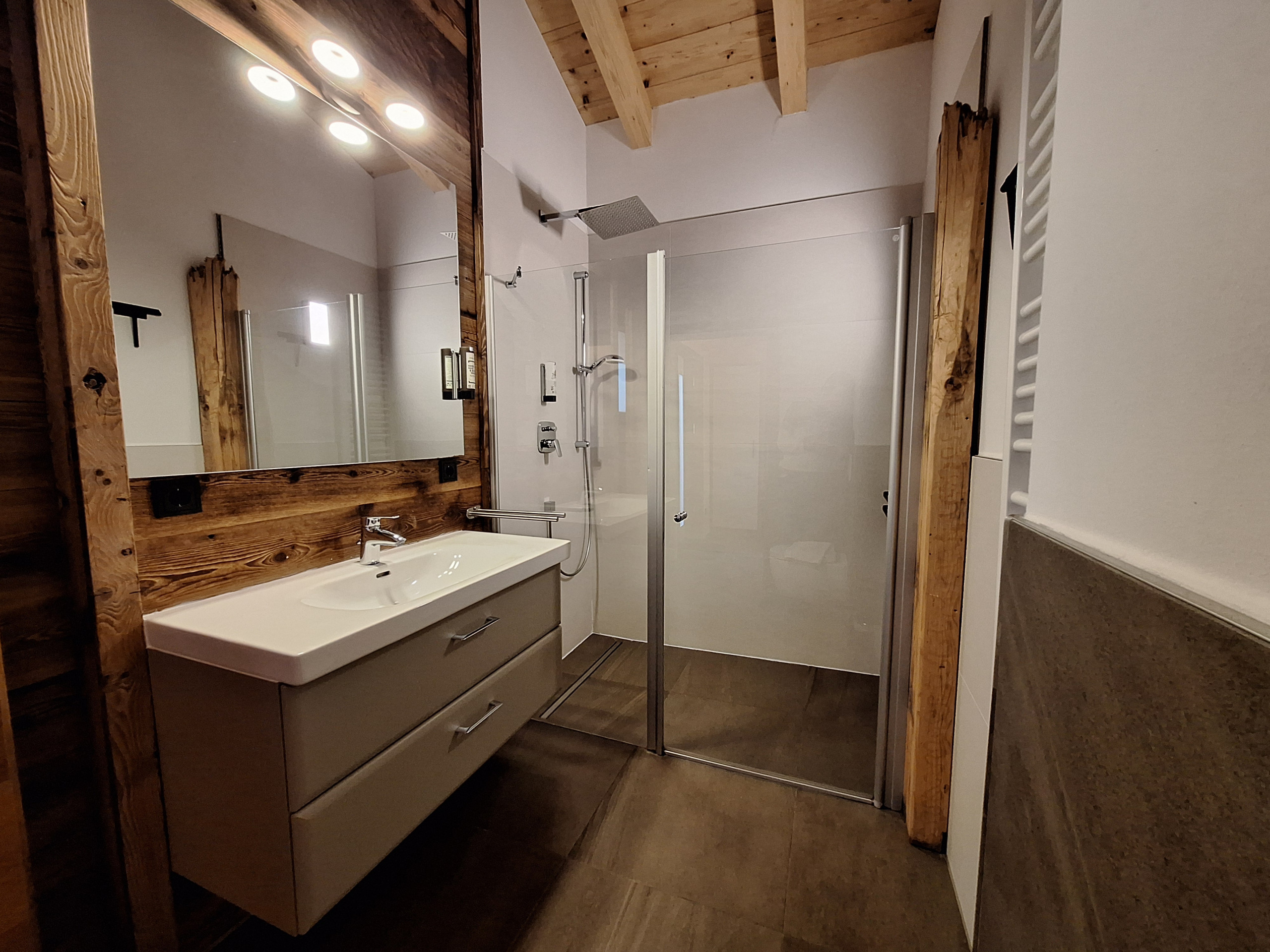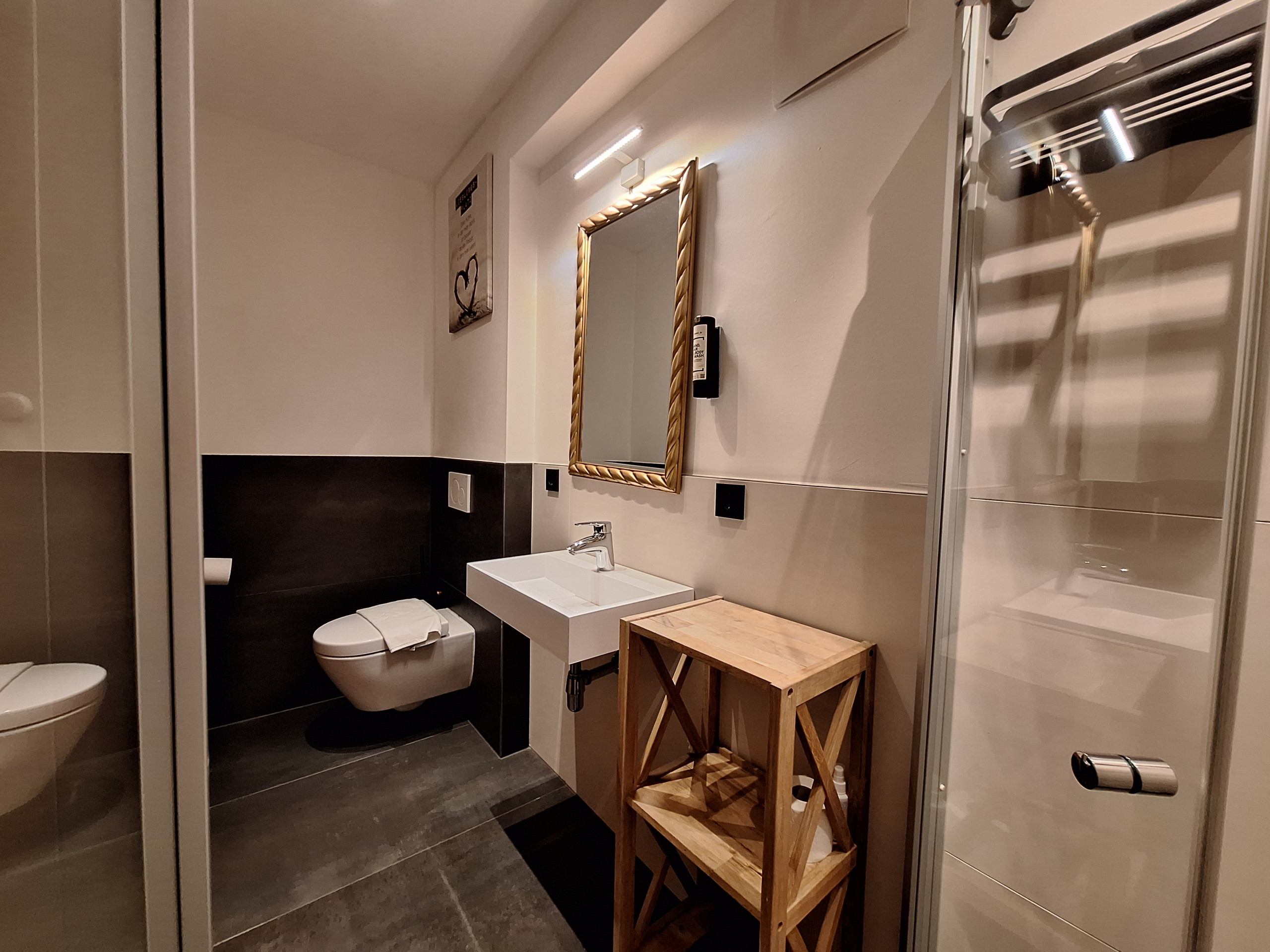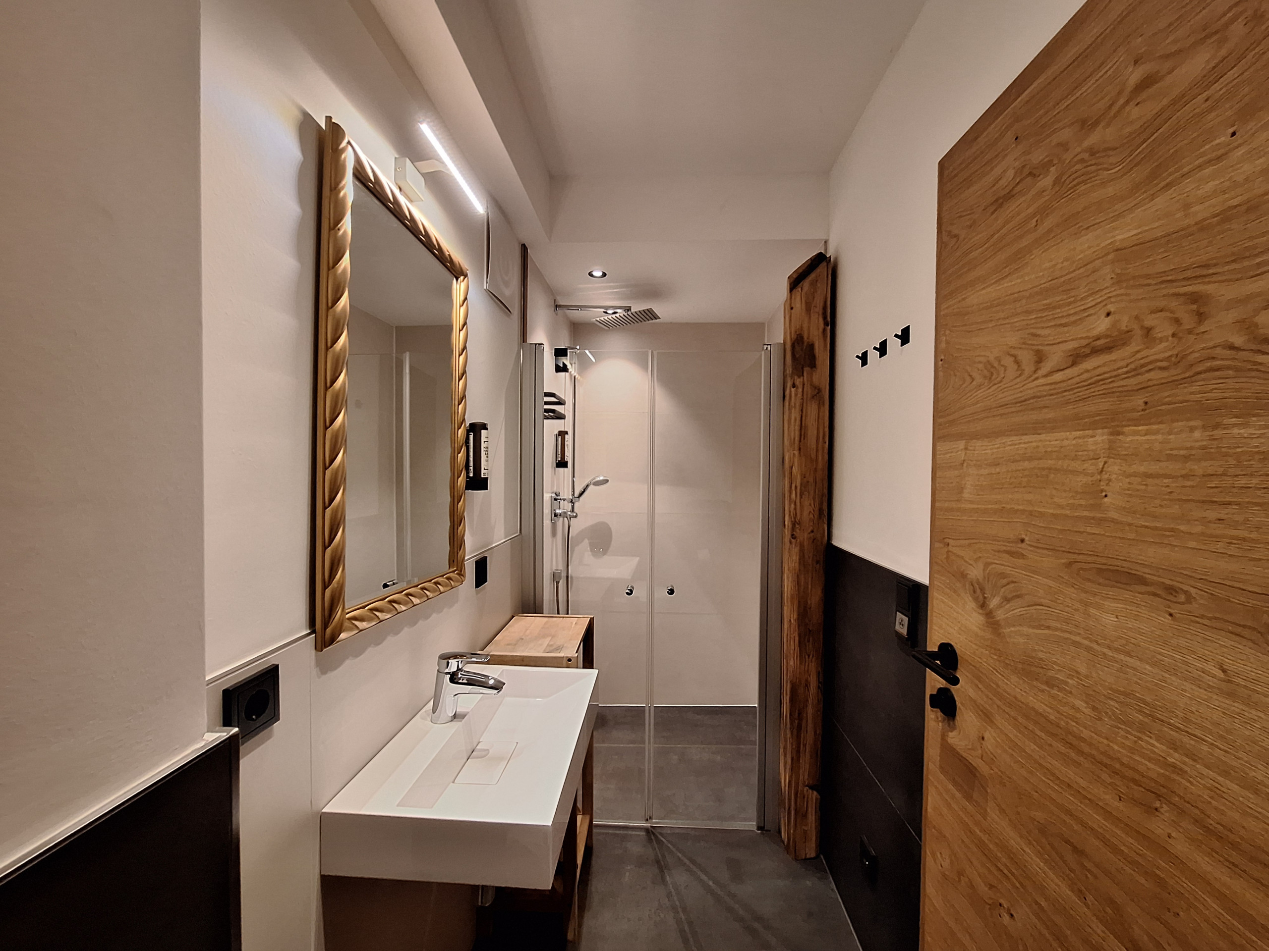 • Badezimmer mit Waschbecken und begehbarer Dusche, extra Gäste-WC