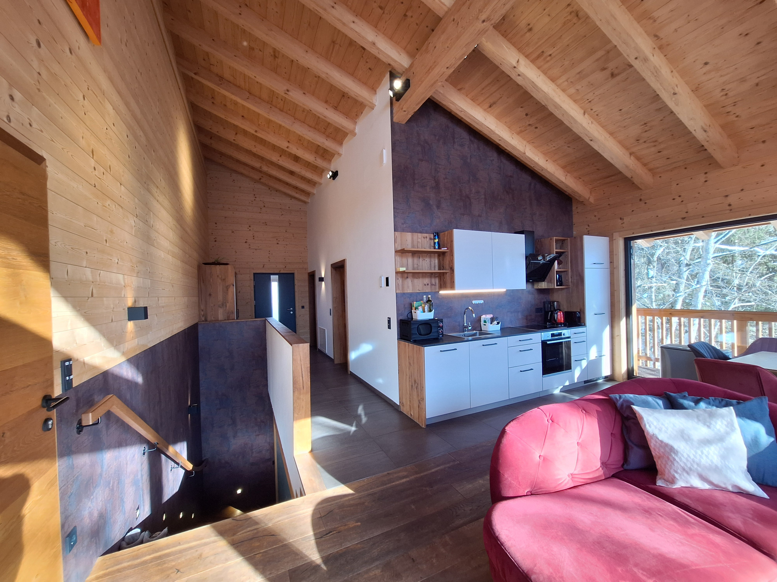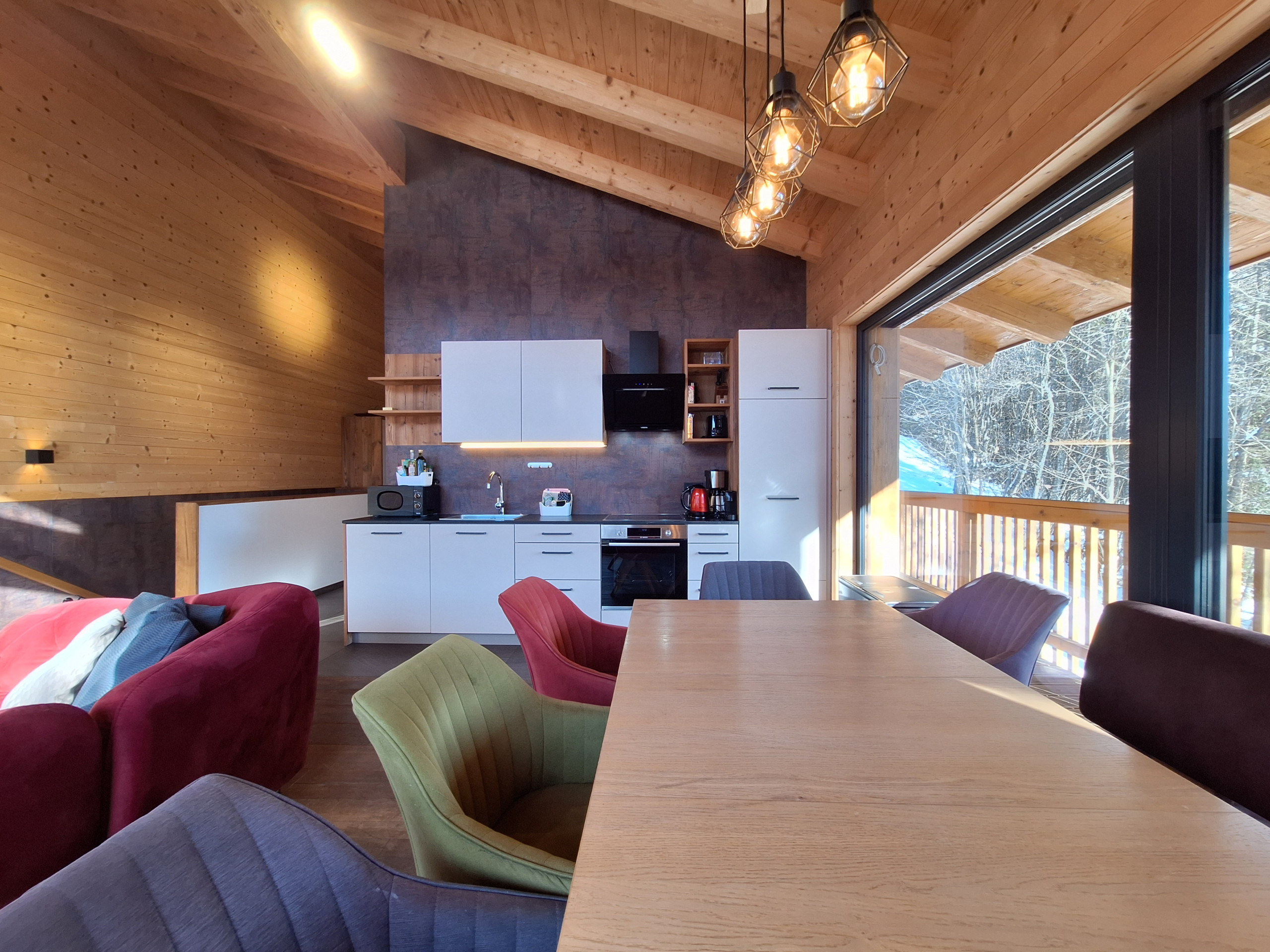 • Wohnküche: Küche mit 4-Platten Cerankochfeld, Backrohr, Dunstabzug, Spüle, Kühlschrank mit Gefrierfach, Geschirrspüler, Filterkaffeemaschine, Nespresso-Kaffeemaschine (Kapseln), Wasserkocher und Toaster, großer Esstisch, Eck-Couch und Flat-TV