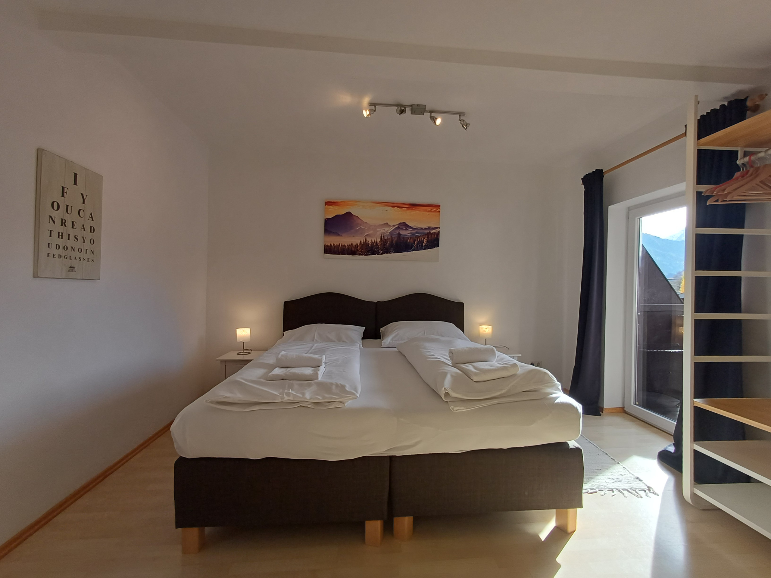 Zweiter Stock: Hier erwarten Sie 2 weitere großzügige Schlafzimmer mit Box Spring - Doppelbetten und Stauraum. Auch hier ist ein Schlafzimmer an den Panorama-Balkon angebunden und verfügt über einen Fernseher.